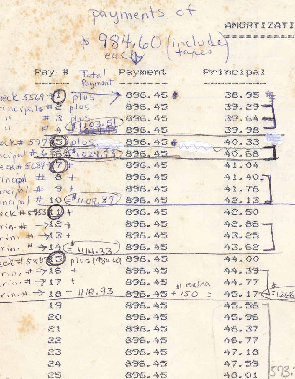 | Comments:During my downsizing following Nedra's death, I ran across this amortization schedule. It captured the essence of our 54-year marriage. We worked together tirelessly to establish our homestead. The house we built was above our means, but by doing much of the work ourselves, and competitively sourcing materials, we (all four of us) were able to build it for about 2/3 of its appraised value following construction. The writing is in Nedra's hand, but paying off the house was a joint project. Every month, we evaluated how much we could spare on extra principal. Some months, none; some months, we paid down several months. Doing that and refinancing at every opportunity we were able to own our home several years sooner than on-time payments would have done. We were lucky to find a partner whose mindsets matched. I could not have done better and I know it. |